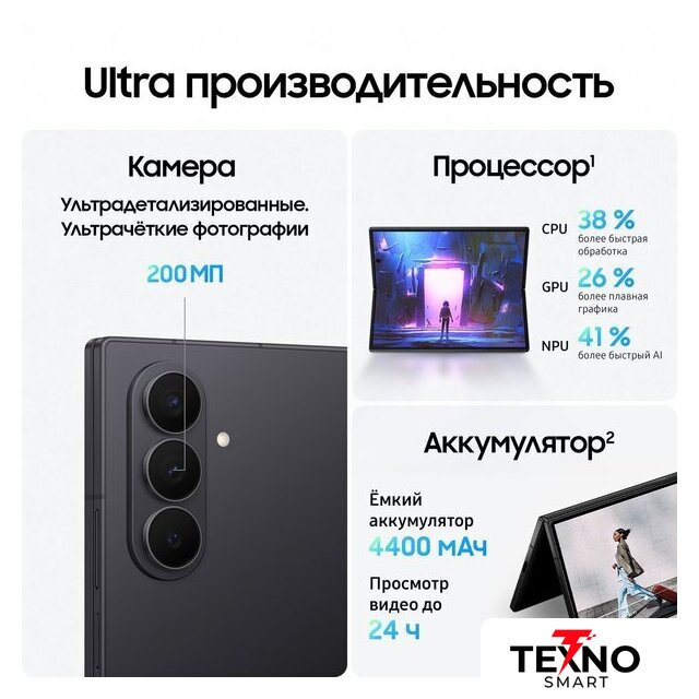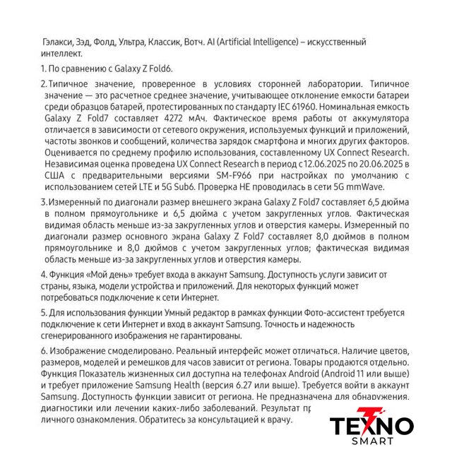 Отличия от предыдущего поколения | ✅ В Galaxy Z Fold7 реализовано несколько инноваций, которые отличают его не только от Galaxy Z Fold6, но и от любого другого складного смартфона на рынке. Во-первых, широкие дисплеи как внутри, так и снаружи. Диагональ внешнего экрана теперь составляет 6.5 дюйма, а основной экран имеет впечатляющую диагональ 8 дюймов с более широким соотношением сторон, что обеспечивает более плавную работу в многозадачном режиме.✅ И хотя дисплеи стали больше, сам смартфон значительно уменьшился в размерах и стал более портативным, чем все предыдущие Galaxy Z Fold, как в сложенном, так и в раскрытом виде. В раскрытом виде его толщина составляет 4.2 мм, а в сложенном — 8.9 мм, что делает его примерно на 25% тоньше Galaxy Z Fold6.✅ В сложенном состоянии экран Galaxy Z Fold7 имеет соотношение сторон 21:9, аналогичное соотношению сторон у премиальных смартфонов моноблокового типа. Такое улучшенное соотношение сторон обеспечивает удобство и естественность набора текста, а также повышает производительность. |