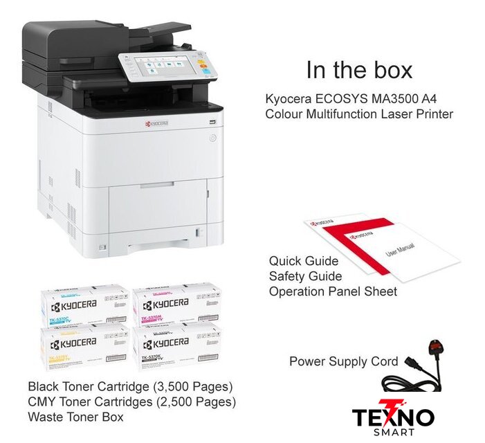 Комплектация | Kyocera ECOSYS MA3500cixСтартовый черный картридж с тонером (3500 страниц)Стартовые цветные картриджи с тонером (2500 страниц)Ящик для отработанного тонераКраткое руководствоРуководство по технике безопасностиЛист панели управленияШнур питания |